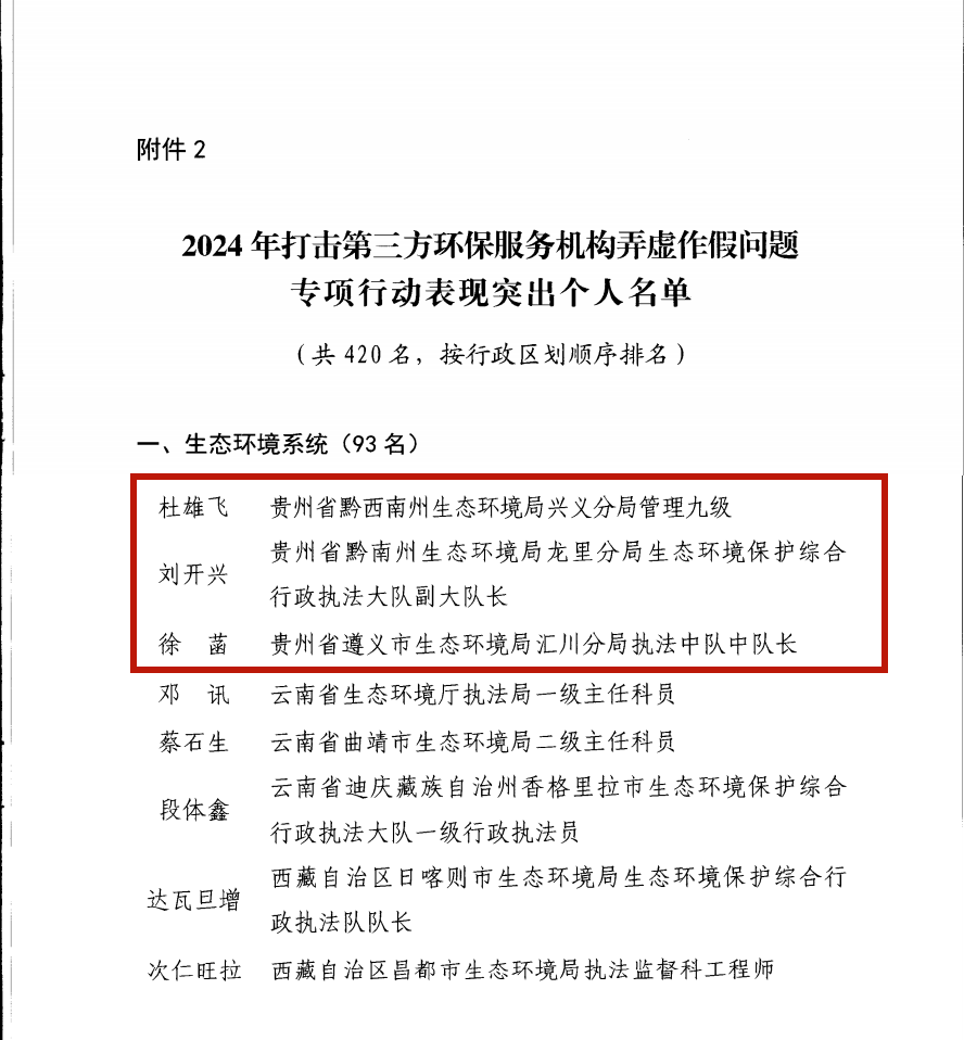 近日,生态环境部、最高人民法院、最高人民检察院、公安部、市场监督管理总局联合对在2024年打击第三方环保服务机构弄虚作假问题专项行动中表现突出的154个集体和420名个人予以通报表扬。其中,贵州三人获表现突出个人通报表扬!