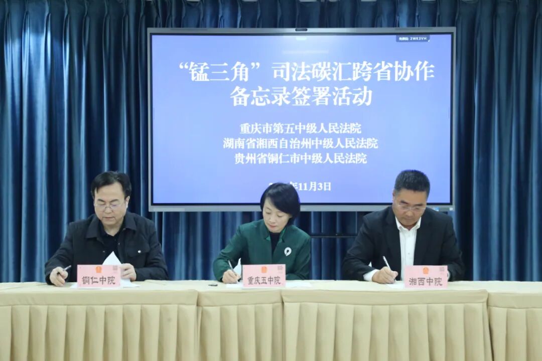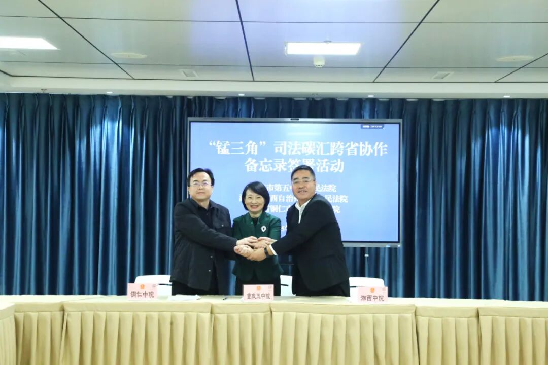 11月3日,重庆五中院、湘西中院与铜仁中院签署《“锰三角”司法碳汇跨省协作备忘录》,共同启动“锰三角”区域司法碳汇跨省协作机制。此举标志着“锰三角”区域环境资源司法协作迈入新阶段,为推动区域生态文明建设与绿色发展注入司法动能。