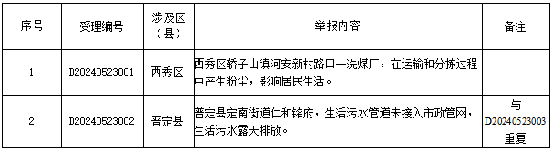 从污染类型看,反映大气污染问题1件、水污染问题1件。从区域分布看,西秀区1件,普定县1件。