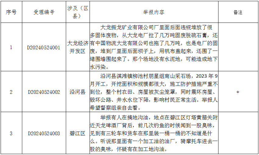 5月24日,贵州省第八生态环境保护督察组接到群众举报3件(来电3件,来信0件),反映生态环境问题的有效举报3件(重点投诉件1件),转交铜仁市3件。