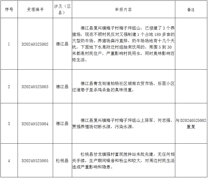 5月25日,贵州省第八生态环境保护督察组接到群众举报6件(来电6件,来信0件),反映生态环境问题的有效举报4件(重点投诉件0件),重复投诉1件(D20240525004与D20240525002重复),转交铜仁市3件。