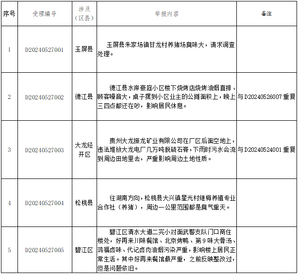 5月27日,贵州省第八生态环境保护督察组接到群众举报14件(来电13件,来信1件),反映生态环境问题的有效举报11件(重点投诉件0件),重复投诉2件(D20240527002与D20240526007重复;D20240527003与D20240524001重复),转交铜仁市11件。