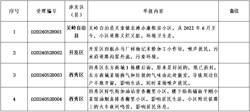 从污染类型看,反映水污染问题1件、噪声污染问题3件、油烟污染问题1件、大气污染问题1件、其他环境问题1件。从区域分布看,分别为西秀区2件、关岭自治县1件、开发区1件。