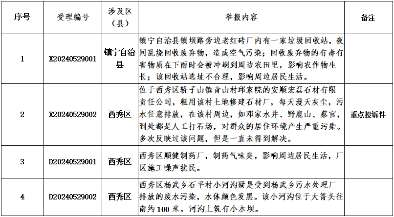 5月29日,贵州省第九生态环境保护督察组接到群众举报7件(来电5件,来信2件),反映生态环境问题的有效举报4件(重点投诉件1件),重复投诉0件,转交安顺市4件。