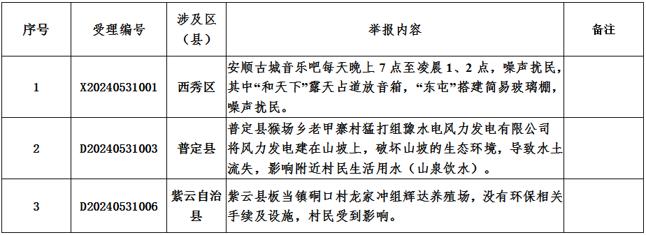 5月31日,贵州省第九生态环境保护督察组接到群众举报11件(来电10件,来信1件),反映生态环境问题的有效举报7件(重点投诉件0件),重复投诉4件(D20240531002、D20240531001与D20240525001重复、D20240531004、D20240531005与D20240531003重复),转交安顺市3件。